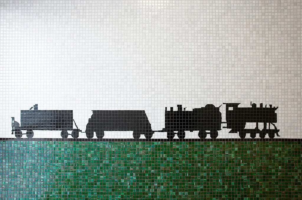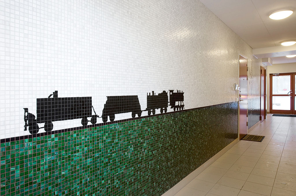 I flera entréer har de detaljerade motiven fått en kulörmatchad fog för att förstärka utsmyckningens olika delar, vilket visar sig tydligt i entrén med godståget.